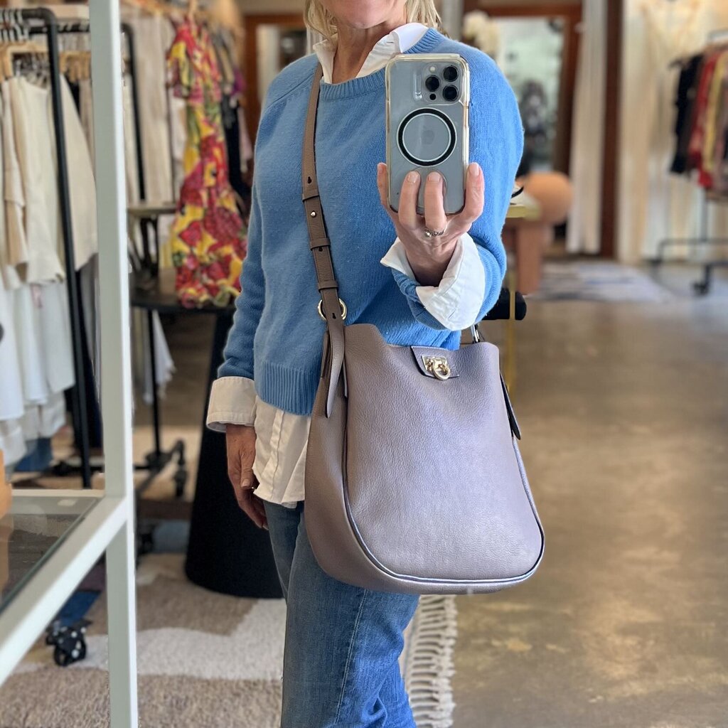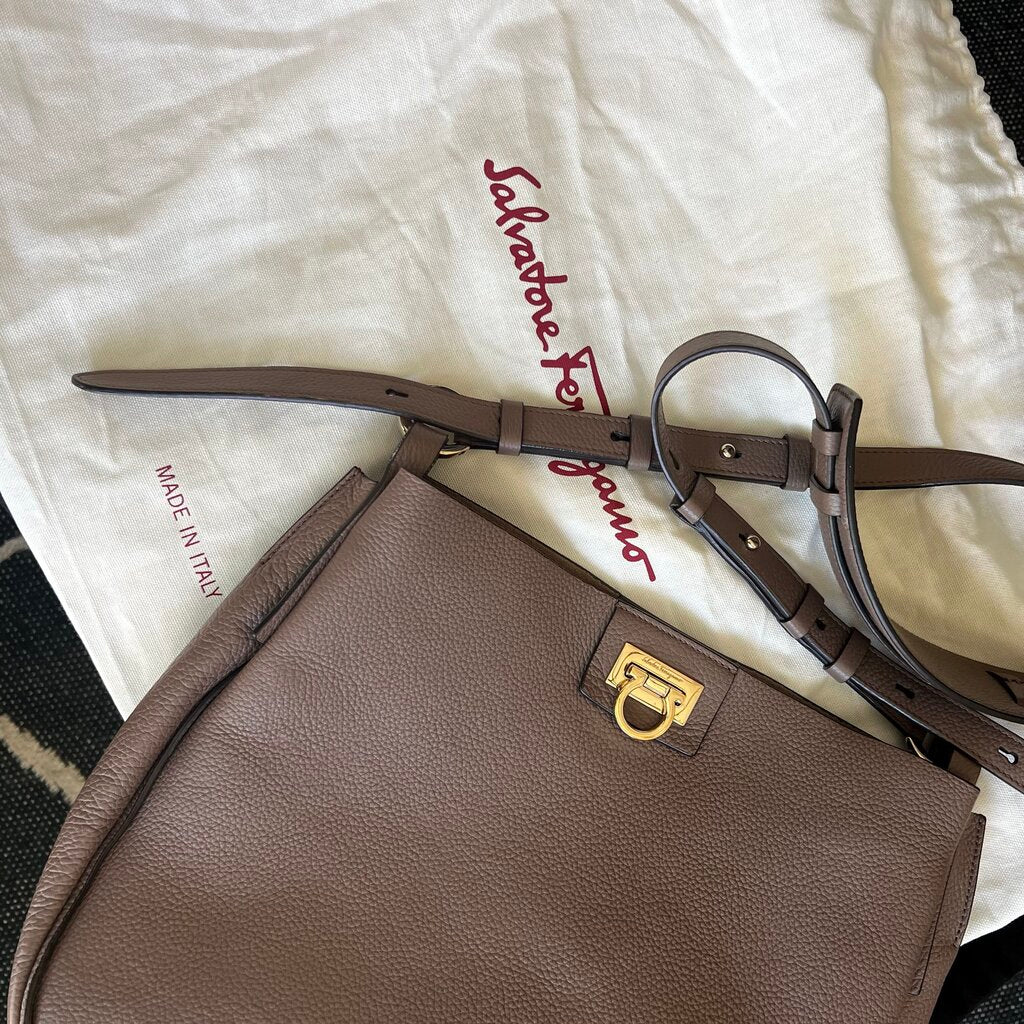 The Ferragamo Pebbled Leather ‘Fanisa Gancini’ Large Saddle Bag features rich, textured leather and a sleek curved silhouette for timeless elegance. Accented with the signature Gancini logo hardware, it offers a spacious interior and adjustable strap for versatile everyday wear.