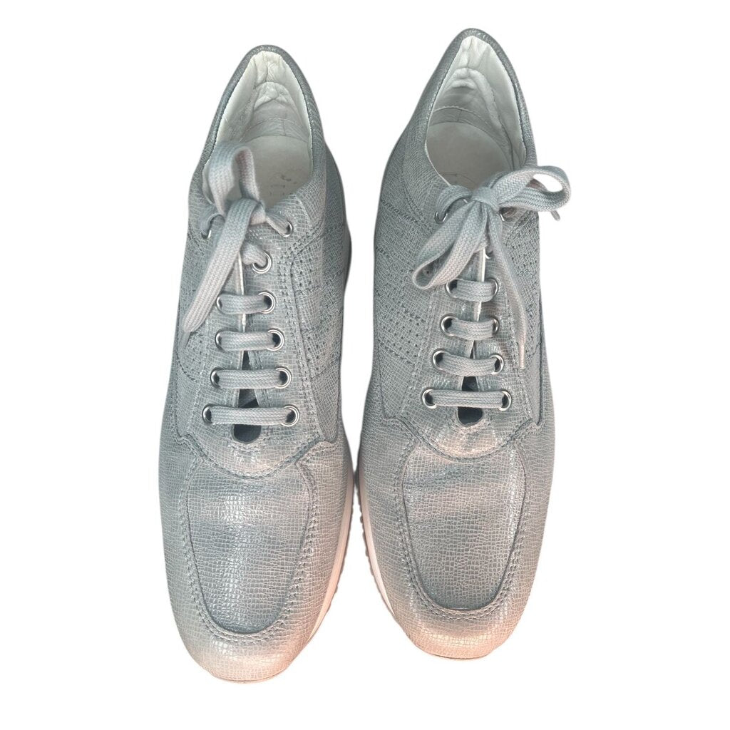 The Hogan Croc-Embossed Patent Sneakers pair a high gloss patent leather finish with a raised crocodile-skin texture, giving them a luxe, fashion-forward edge. Their chunky rubber sole and Hogan’s signature embossed “H” detail lend them both street appeal and brand recognition.