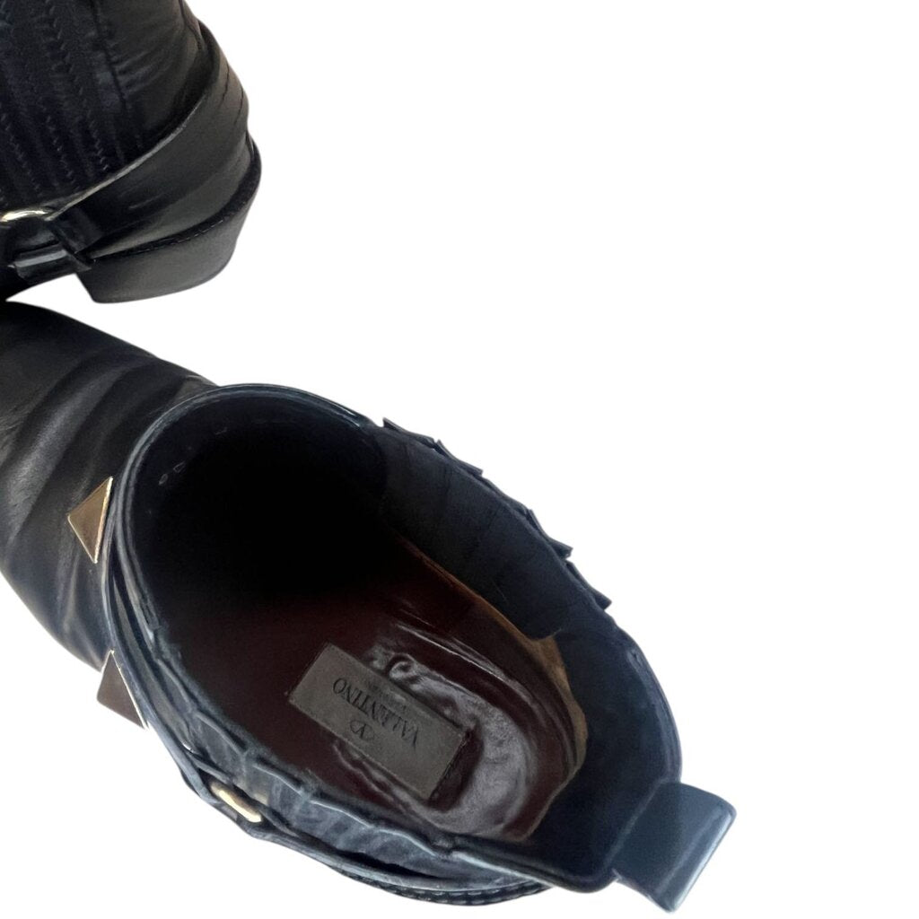 The Valentino Garavani Rockstud Calfskin Western Ankle Booties are luxury ankle boots that blend Western-inspired design with Valentino’s signature edgy glamour, featuring premium calfskin leather and iconic pyramid Rockstud detailing. Made in Italy, they add bold character to outfits while offering a fashion-forward take on classic boot silhouettes.